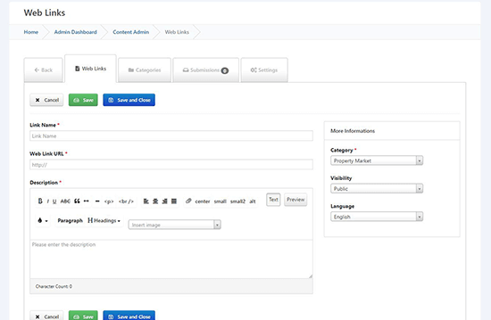 Weblinks Infusion is a turn key solution allowing the management of a web directory based in minutes. The Weblink Infusion supports nested categories, access control, and add link items easily, which makes it a very comprehensive link directory application.